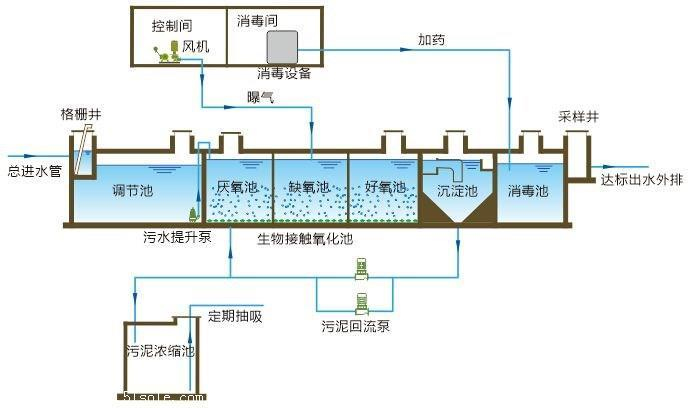 集裝箱式一體化污水凈化設備的重要部件是膜生物反應器(MBR)。污水進入MBR系統,A區為兼氧區,放置填料,并與活性污泥進行充分接觸;O區為好氧區,放置膜組器,使用MBR膜將活性污泥和大分子有機物質截留住,省掉二沉池。活性污泥濃度因此提高,水力停留時間(HRT)和污泥停留時間(SRT)可以分別控制,而難降解的物質在反應器中不斷反應、降解。進一步處理之后,被處理水可以達標排放或回用。此外,輸送到MBR系統中的空氣也是處理過程中重要的一部分,它可以促進反應器中流體的循環流動,提高活性污泥的降解效率,還可以使中空纖維膜膜絲之間發生相互摩擦,清潔膜組件。
