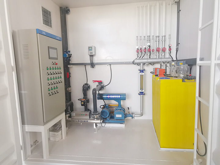 集裝箱形式的標準化產品上市時間為2017年10月,至今已經在南京有較多項目案例。產品內含缺氧、好氧(內含MBBR填料)、沉淀、濾布濾池過濾、消毒(緩釋氯片或紫外設備)、設備間工藝段。預處理后的農村污水通過水泵先進入缺氧區進行反硝化反應、然后再經過好氧區進行硝化反應來去除水中的COD、BOD、氨氮、TN等,生化區出水進入沉淀區(沉淀區前有混凝反應區,進行加藥除磷)進行泥水分離,然后再經過濾布濾池進一步去除水中的SS、消毒設備消毒后后達標排放,出水水質達到《城鎮污水處理廠污染物排放標準》GB18918-2002排放標準。