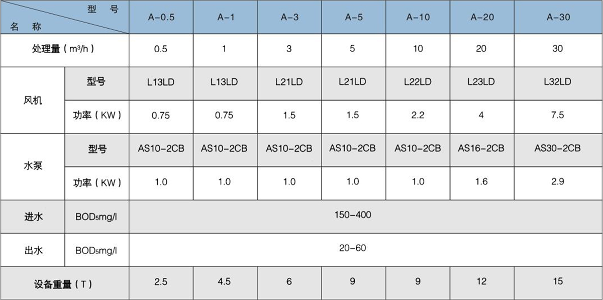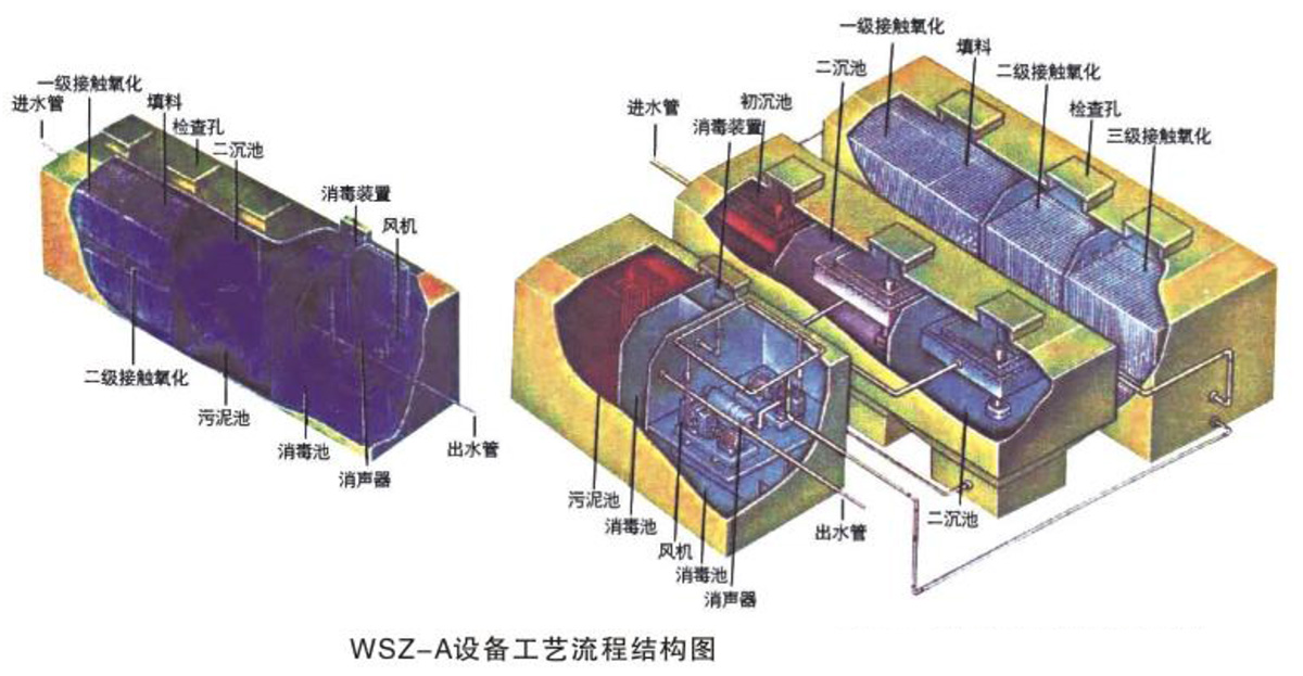WSZ-A設備的設計主要是對生活污水和與之類似的工業有機污水處理,其主要處理手段是采用目前較為成熟的生化處理技術接觸氧化法,水質參數按一般生活污水水質設計計算,進水BOD5按200mg/l計,出水BOD5按20mg/l計。共有六部份組成: