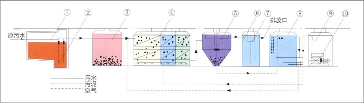 1、初沉池:該設備初沉池為堅流式沉淀池。污水在沉淀池的上升流速為0.3-0.7毫米/秒,沉淀下來的污泥用空氣提至污泥池。(注:WSZ-A0.5-5m³/h污泥自流到污泥池中)