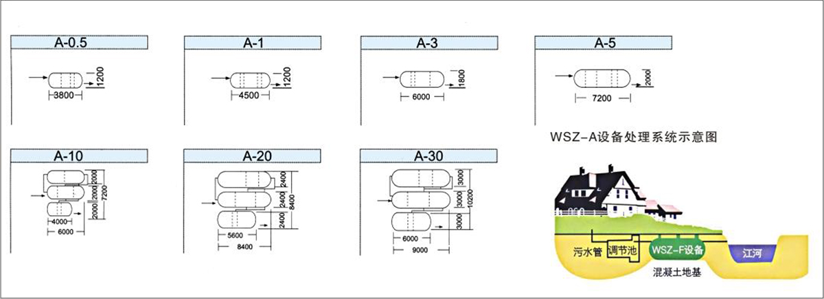 5、污泥池:二沉池的所有污泥均用空氣提至WSZ-A的污泥池內進行好氧消化,污泥池的上清液加流至調節池內進行再處理,消化后剩余污泥很少,一般1-2年清理一次,清理方法可用吸糞車從污泥池的檢查孔伸入污泥底部進行抽吸后外運即可。( WSZ-A0.5-5m³/h污泥采用大厭氧消化)
